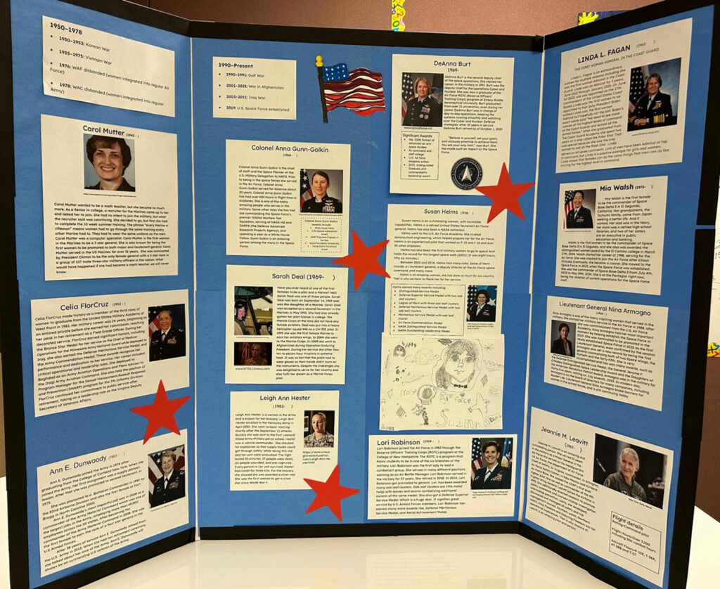 Prior to their visit, the NVMM was contacted about displaying student research projects completed by cognitively gifted fifth grade students at the school. Each student selected either a women’s military organization or a woman Veteran to research as they learned about the significant contributions of women to the United States military throughout history. Following the completion of their work, students created three display boards organized in a timeline format and brought these displays on the day of their field trip.